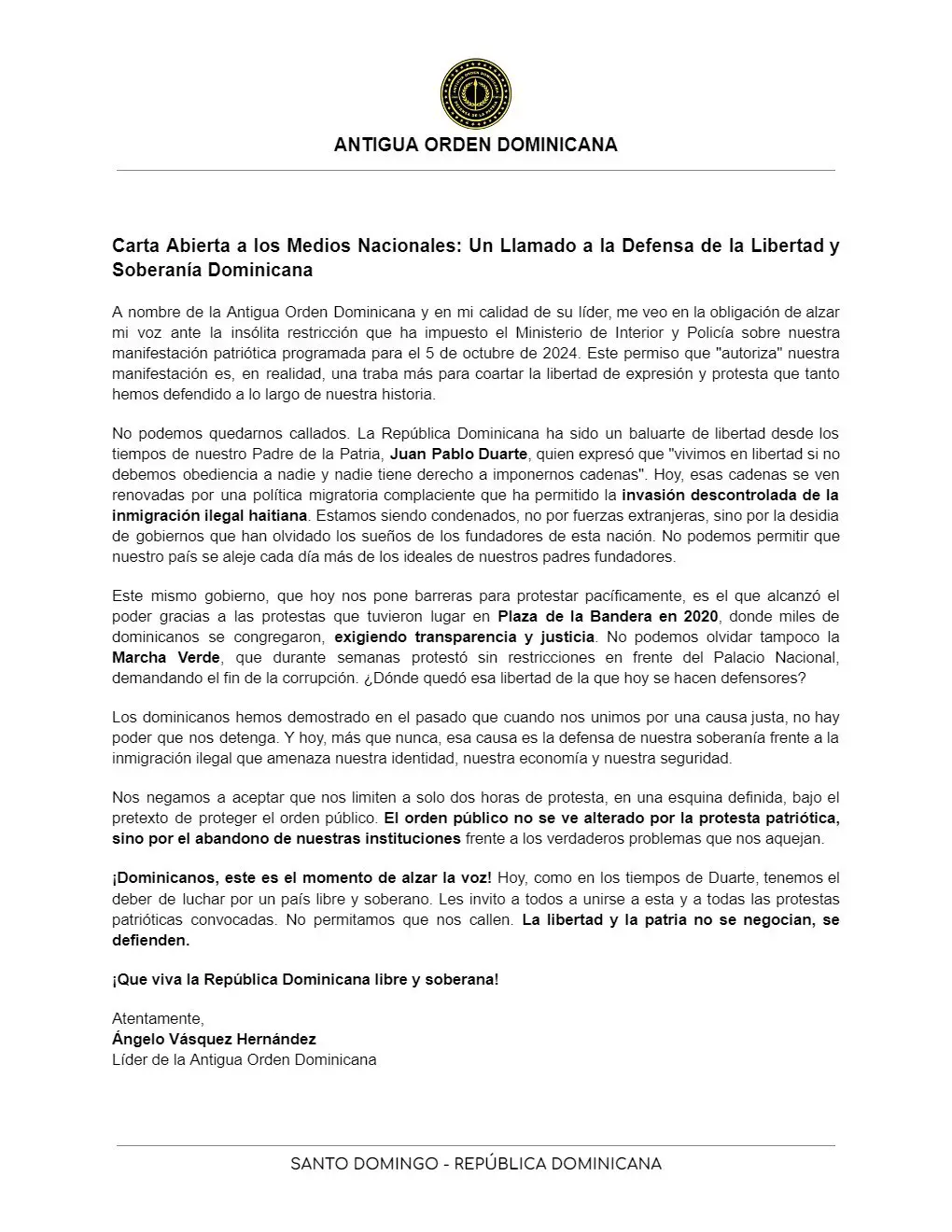 Santo Domingo.- En una carta abierta dirigida a los medios nacionales, Ángelo Vásquez Hernández, líder de la Antigua Orden Dominicana, levantó su voz en contra de lo que considera una restricción insólita impuesta por el Ministerio de Interior y Policía a su manifestación programada para el 5 de octubre de 2024.