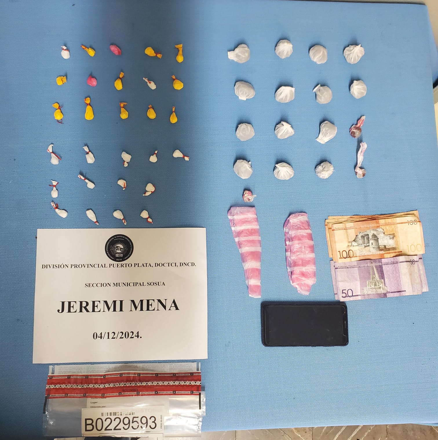 El detenido es Jéremi Mena a quien se le ocuparon 45 porciones de estupefacientes (cocaína, marihuana y crack) que distribuía como mercancía a sus clientes tecatos en la comunidad Sabaneta de Cangrejos.