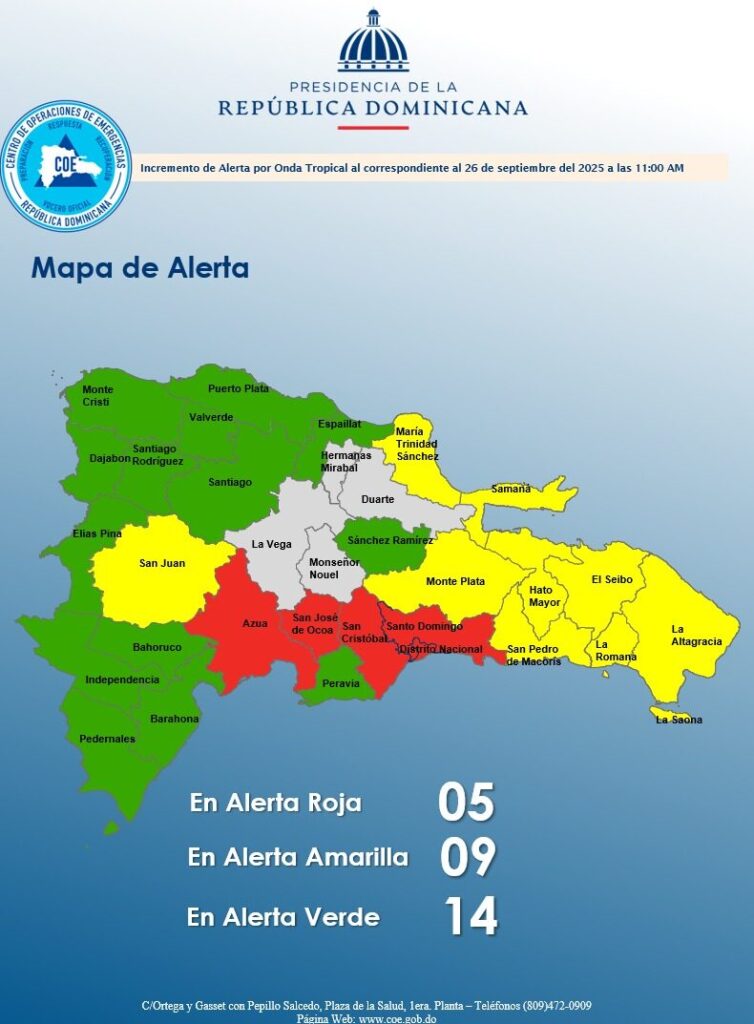 Ante esta situación, el COE mantiene alerta roja en El Gran Santo Domingo, San Cristóbal, San José de Ocoa y Azua; mientras que en alerta amarilla se encuentran María Trinidad Sánchez, San Pedro de Macorís, El Seibo, San Juan, Monte Plata, La Altagracia, Samaná y Hato Mayor.