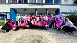 El personal administrativo y docente se vistió con prendas de color rosado, símbolo de la lucha contra el cáncer de mama, y portó globos del mismo color, mostrando su respaldo a las mujeres que enfrentan esta enfermedad y en honor a aquellas que han perdido la batalla.