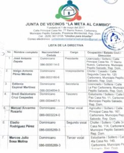 Montecristi.- Con el interés de proyectar las buenas costumbre, imagen, luchar por los problemas que aquejan al sector, ademas de expandir la cultura social y religiosa, quedó conformada la nueva directiva de la Junta de Vecinos de la comunidad ¨Carbonera¨ en el municipio Pepillo Salcedo de esta provincia.