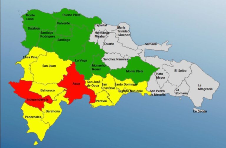 Mientras que en alerta verde: Puerto Plata, Monte Plata, Monseñor Nouel, Dajabón, La Vega, Santiago y Valverde.