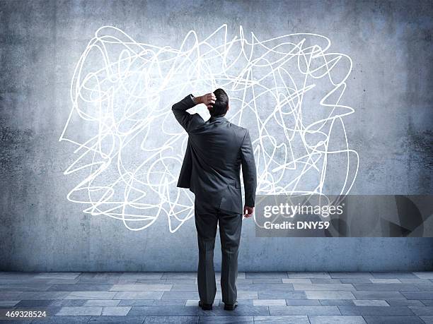 A confused businessman stares at a scribble design that is painted on a wall. It represents the confusion and stress that some people feel in everyday life. He is looking up while standing with his back to the camera.