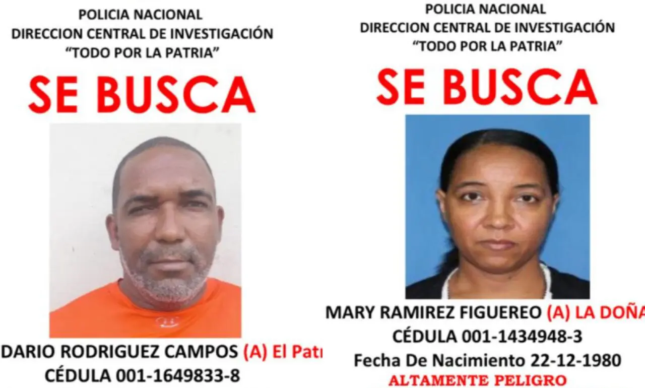 La Policía identificó a los prófugos como Rubén Darío Rodríguez Campos, de 43 años, apodado ‘El Patrón’, y Mary Ramírez Figuereo, de 44 años, conocida como ‘La Doña’. En su informe, advirtió que ambos representan un alto nivel de peligrosidad y presuntamente están fuertemente armados.