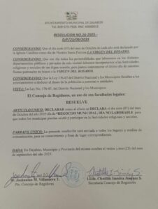 Dajabón.- La sala capitular del ayuntamiento de este municipio, declaró este martes regocijo municipal, día no laborable, por la conmemoración el día de nuestra señora del Rosario, patrona de la Iglesia Católica y Fiestas Patronales.