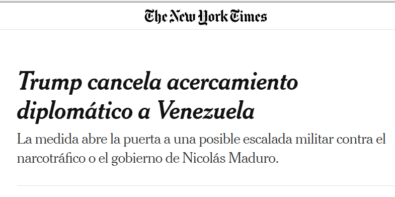 El presidente Donald Trump canceló los esfuerzos diplomáticos con Venezuela, según informó The New York Times, lo que podría derivar en una escalada militar contra los cárteles de drogas o el gobierno de Nicolás Maduro. La decisión se produjo tras meses de negociaciones encabezadas por Richard Grenell, y en medio de críticas internas de funcionarios que consideran que Maduro no cumpliría con las demandas estadounidenses.