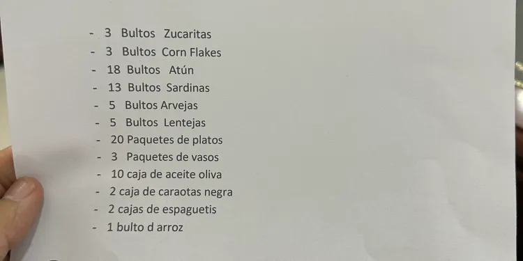 3 .fundas de zucaritas, 3. bultos de cord flakes, 18 bultos de Atún, 13. bultos de sardinas, 5 bultos de arvejas, 5 bulto de lentejas, 20 paquetes de platos, 3 paquetes de vasos, 10 cajas de aceites de oliva, 2 cajas de caraotas negra, 2 cajas de espaguetis, 1 bulto de arroz.