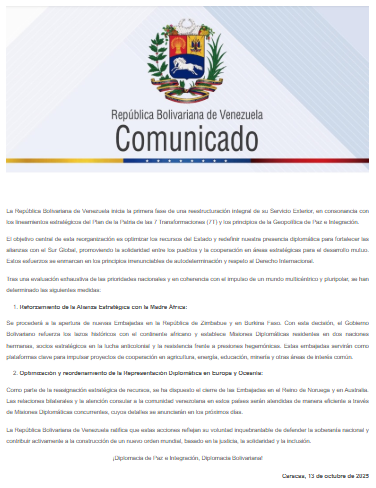 La medida contra Noruega no fue un hecho aislado. En el mismo comunicado, Venezuela anunció también el cierre de su embajada en Australia y la apertura de nuevas sedes diplomáticas en Zimbabue y Burkina Faso, en línea con sus “principios geopolíticos de paz e integración” y su acercamiento al Sur Global.